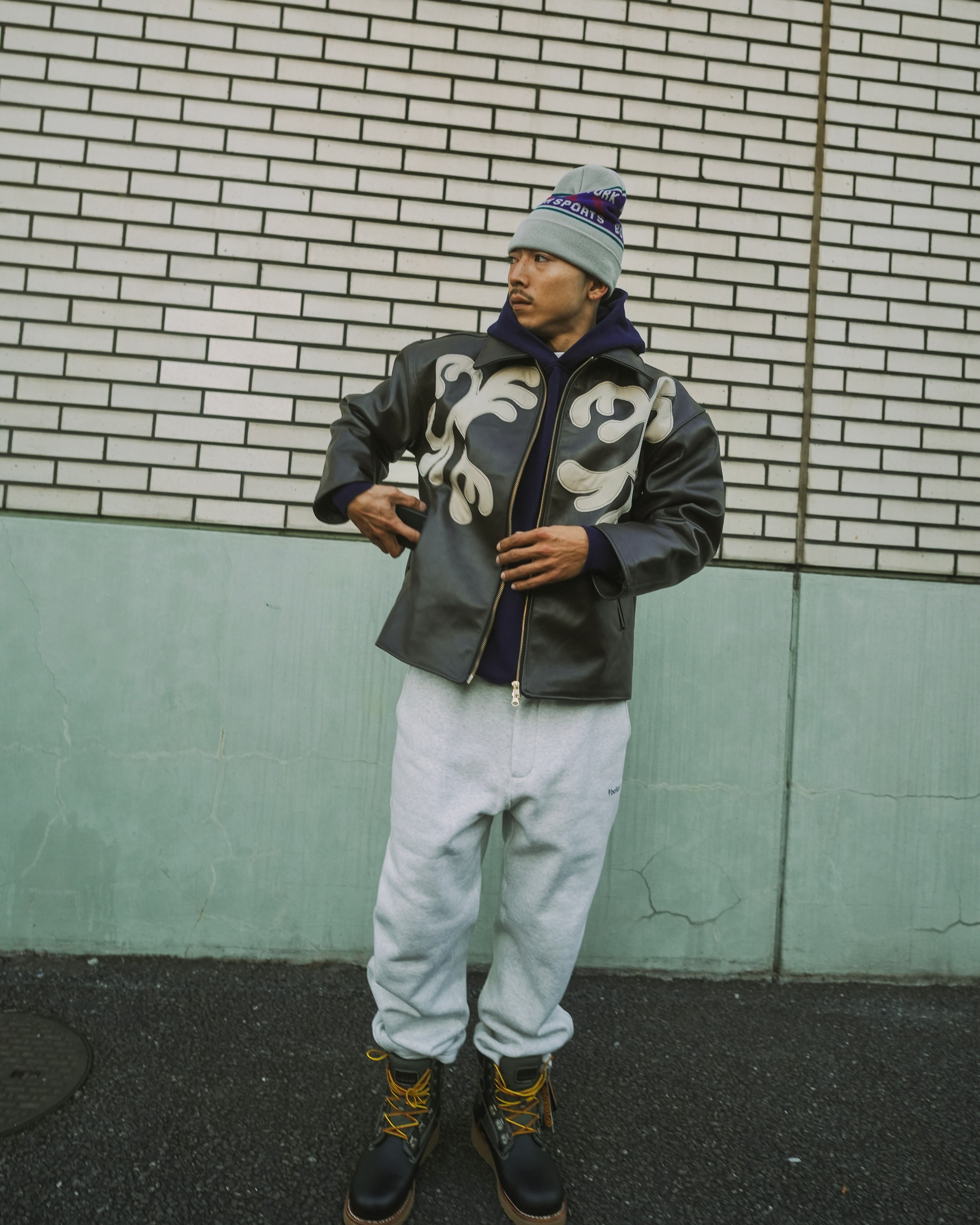 フロントにはNY装飾模様をスエードで型取り縫い付けられています。